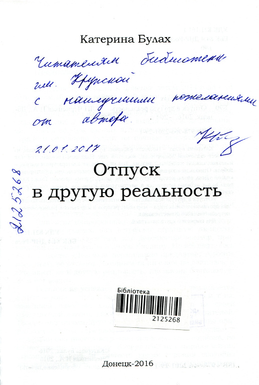| Аннотация: | Катерина Булах – писатель, родом из Полтавщины, из тех самых мест сказочной Малороссии, воспетой еще Николаем Гоголем, где, как известно, каждая женщина – ведьма. Тем не менее, ее «литературная магия» - добрая. Отпуск в другую реальность – фантастический роман, объединяющий два противоположных мира – мир войны, разоров и мир сытого, размеренного, потребительского существования.