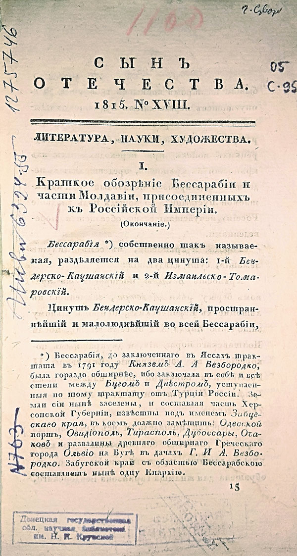 | Аннотация: | «Сын отечества» – один из старейших русских журналов, сыгравших важную роль в развитии общественной мысли начала XIX в. Был основан в 1812 г. Н.И. Гречем как исторический и политический орган, посвященный событиям Отечественной войны 1812 года. Выходил в Москве в 1812–1844, 1847–1852 гг. Изд.-ред. (в разное время): Н.И. Греч, А.Ф. Воейков, Ф.В. Булгарин, О.И. Сенковский, А.Ф. Смирдин и др. В 1814 г. в журнале появился постоянный литературный отдел, публиковавший художественные произведения, критику, библиографию. Печатались солдатские и народные песни, басни И.А. Крылова «Волк на псарне», «Обоз», «Ворона и курица», статьи А.П. Куницына, И.К. Кайданова. В начальный период с журналом сотрудничали К.Н. Батюшков, Г.Р. Державин и др.