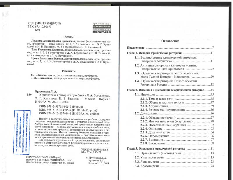 | Аннотация: | Наряду с теоретическими основаниями учебник содержит сведения по истории красноречия и культуре юридической речи. Авторы со всей возможной полнотой представили классические части инвенции - теорию аргументации и теорию общих мест, а также актуальные проблемы современной коммуникации в риторическом аспекте. Именно поэтому большое внимание в учебнике уделяется словесной манипуляции - способам ее опознавания и противодействию манипулятивной коммуникации.