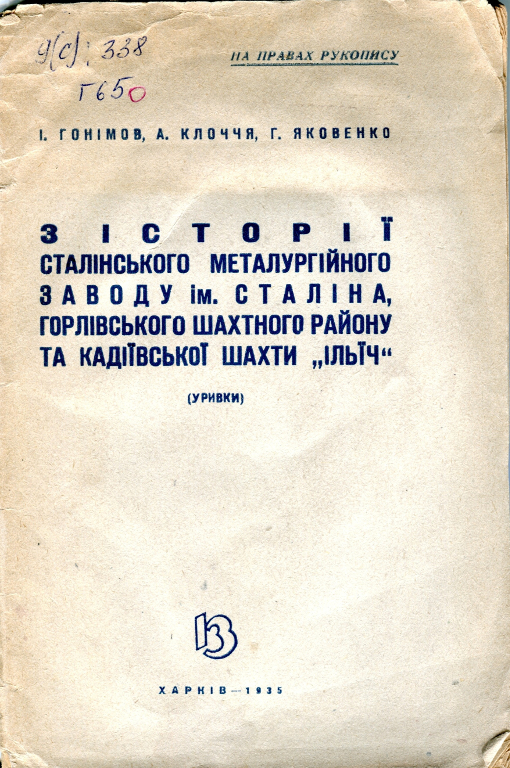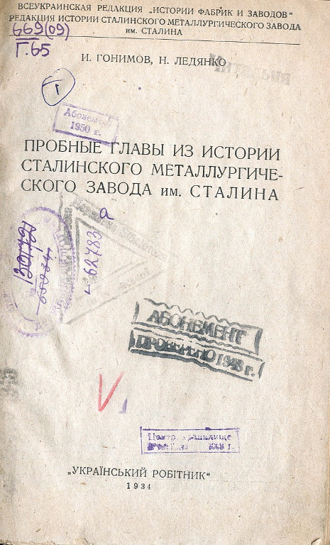 В 1931 году, в эпоху бурного развития социалистического строительства Максимом Горьким в газете «Правда» была выдвинута идея создания серии книг под названием «История фабрик и заводов», где отмечалось, что история заводов должна наиболее полно осветить историческое прошлое и помочь не только знанию прошлого, но и осмыслению настоящего, современной действительности. Эта инициатива вызвала интерес и была подхвачена многими писателями, на призыв откликнулся и активно включился в работу по созданию истории Сталинского металлургического завода и Илья Александрович Гонимов. Издания, представленные на выставке, позволяют проследить историю книги от её зарождения до выхода в свет. |
